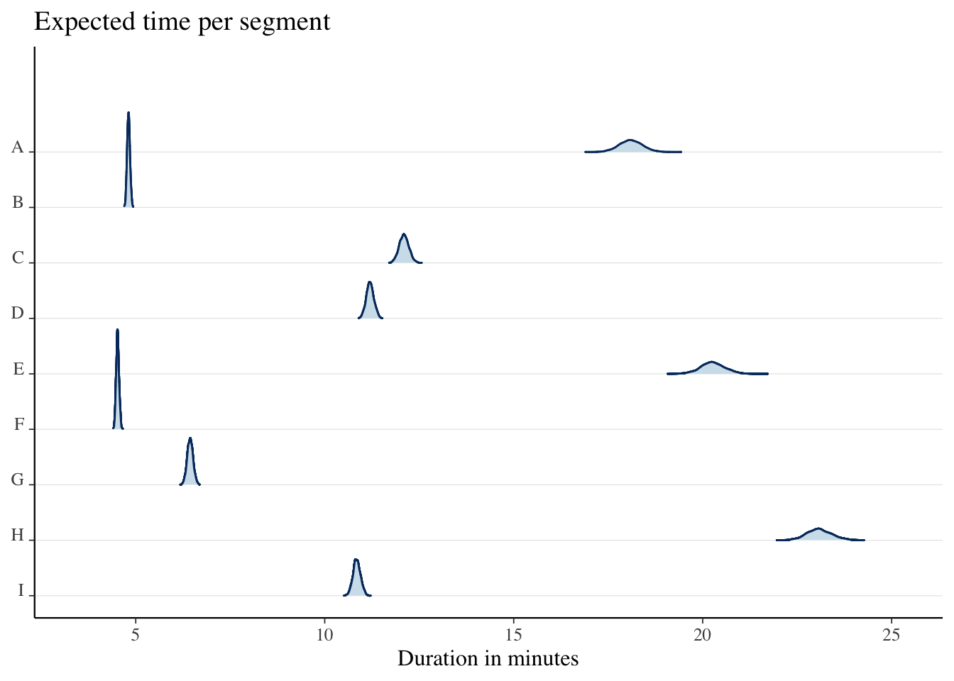 Similarly, we can plot the expected time for each segment. However, we have to sum the segment coefficient and intercept first and then exponentiate them. This way we get expected time per segment in minutes. Since we have at least a couple hundred attempts per segment, segment times have less uncertainty around them.