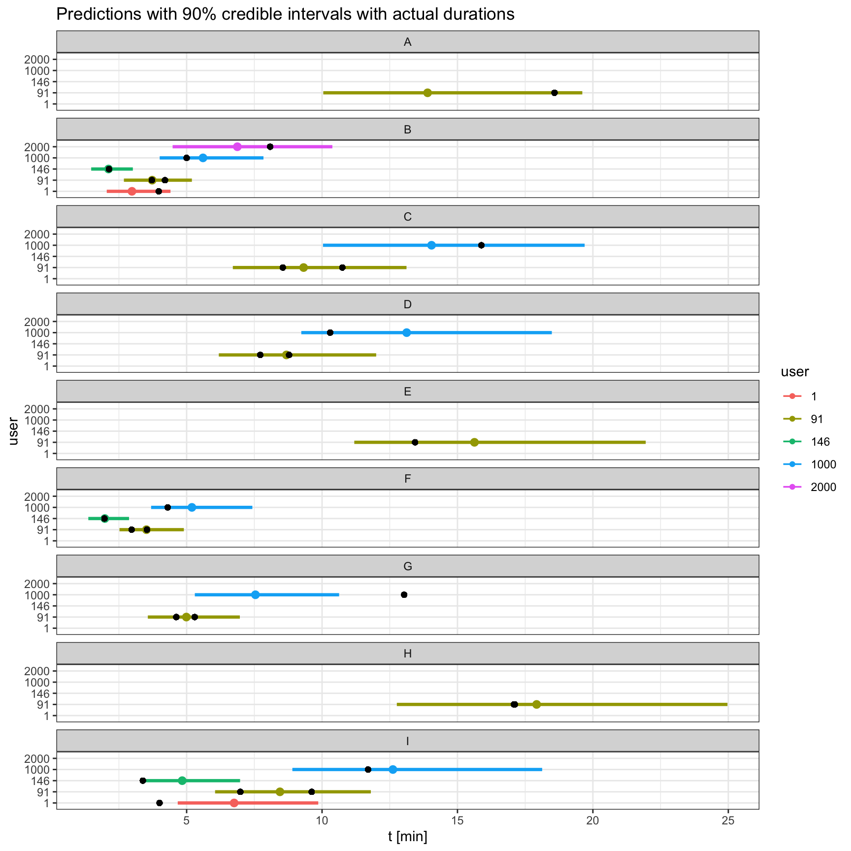 Our findings align with the data. Segments B and F seem to have the shortest times. Users 1000 and 2000 take more than others to finish the segments, aligning with their lower abilities. Coverage of 90% credible intervals looks okay.