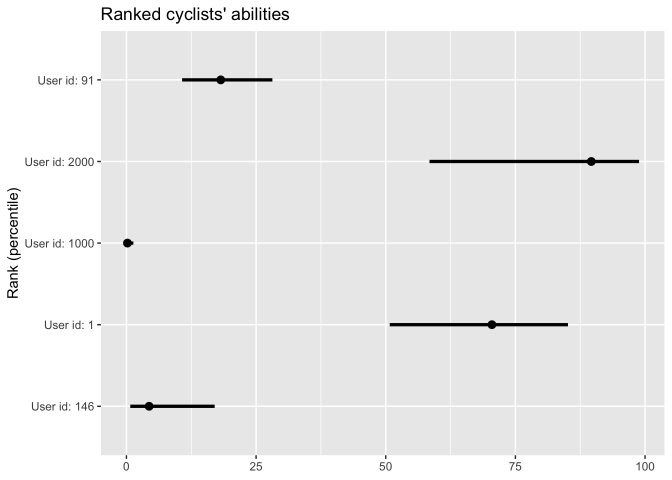 Ability tells you how fast you are relative to the average cyclist. However, some people might be interested in knowing how well they stand against the broader population, i.e. rank of their ability. The most direct method for this is to rank a cyclist’s posterior draws for their ability against everyone else, assigning them a percentile score between 0 and 100. This method can become time-consuming, especially with a large number of cyclists.