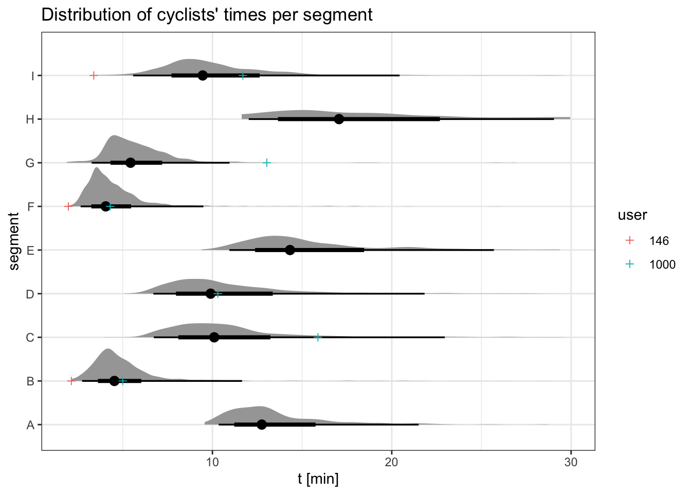 df |>ggplot(aes(t, segment)) + tidybayes::stat_halfeye() +geom_point(aes(t, segment, color = user), shape =3, data =filter(df, user %in%c(146, 1000))) +labs(title ="Distribution of cyclists' times per segment", x ="t [min]")