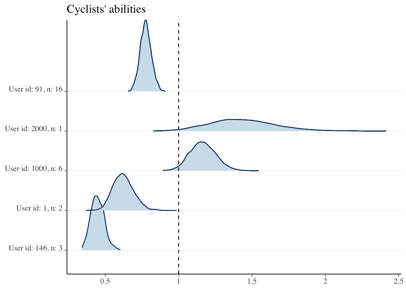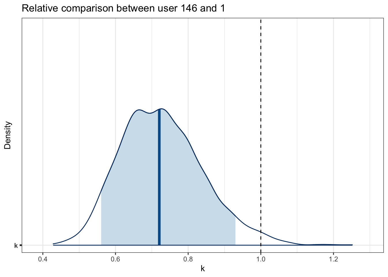 Bayesian inference lets us directly compare abilities. For instance, user: 146 is likely faster than user: 1. To understand this difference, we’ll examine the posterior samples of their abilities. By comparing these, we find that cyclist user: 146 takes around 30% less time than cyclist user: 1 on the same segment. To make a relative comparison k, we divide their exponentiated abilities.