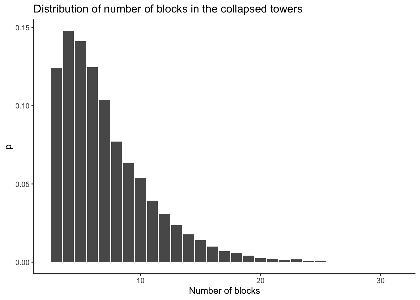}To get the approximation for the average number of bricks in the collapsing tower, we simulate building ten thousand towers.