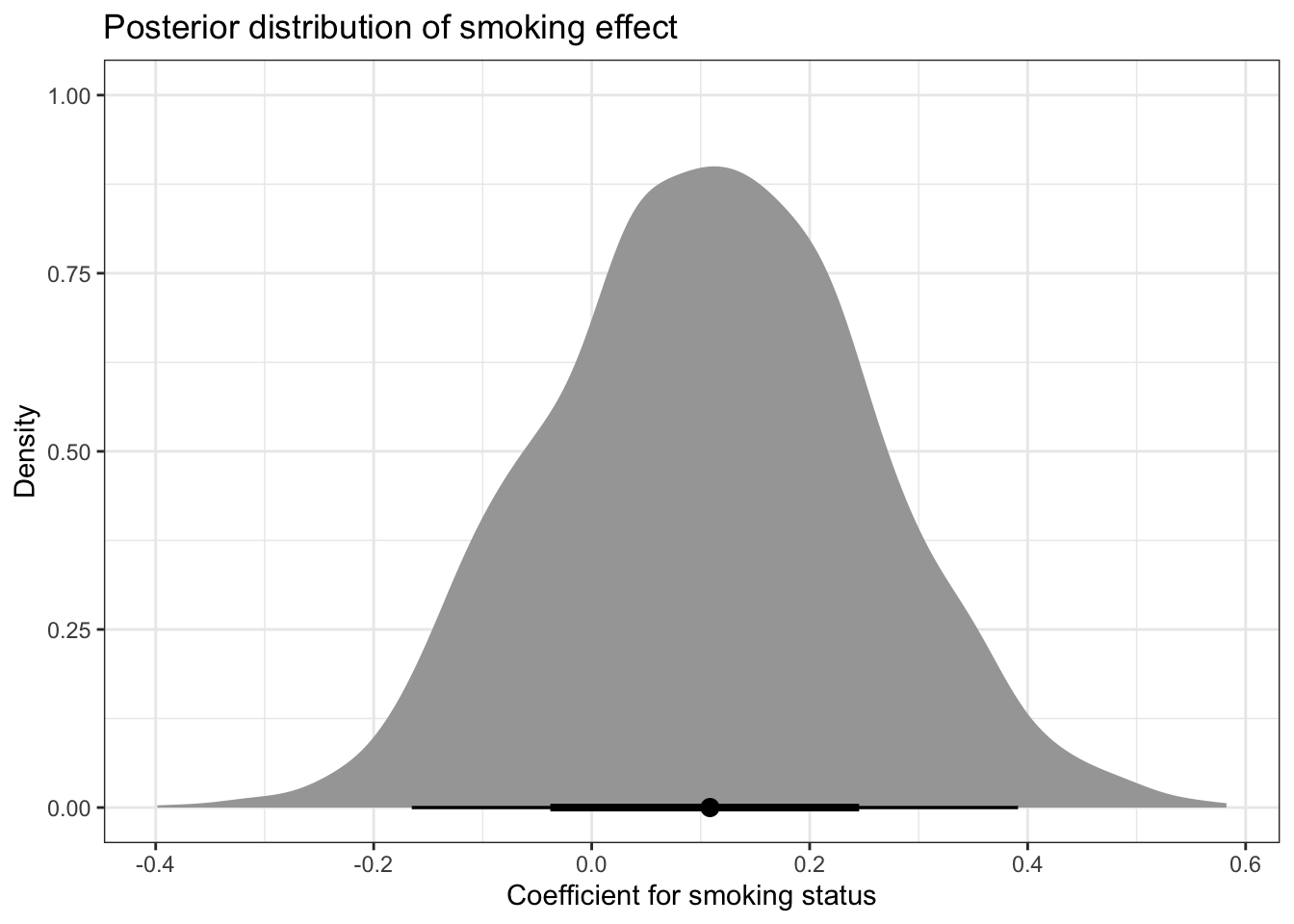 posterior_draws <-as_draws_df(m)posterior_draws|>ggplot(aes(x = b_is_smoker)) +stat_halfeye() +labs(title ="Posterior distribution of smoking effect",x ="Coefficient for smoking status",y ="Density" )