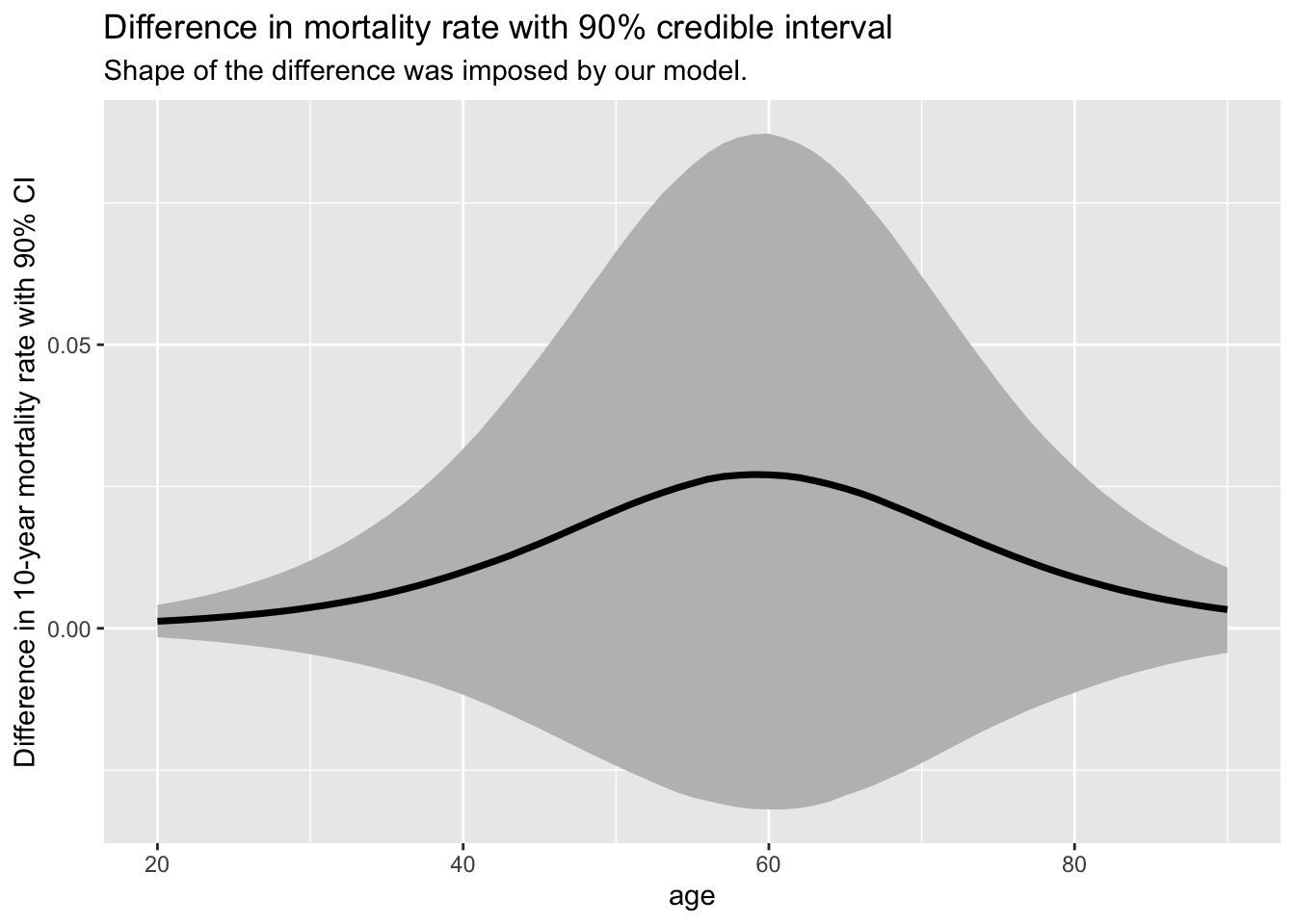 There seems to be up to ~3% mean increase (90% credible intervals range roughly between 10% and -2.5%) in the 10-year mortality rate for around age 60 which shrinks for younger and older. This might make sense: