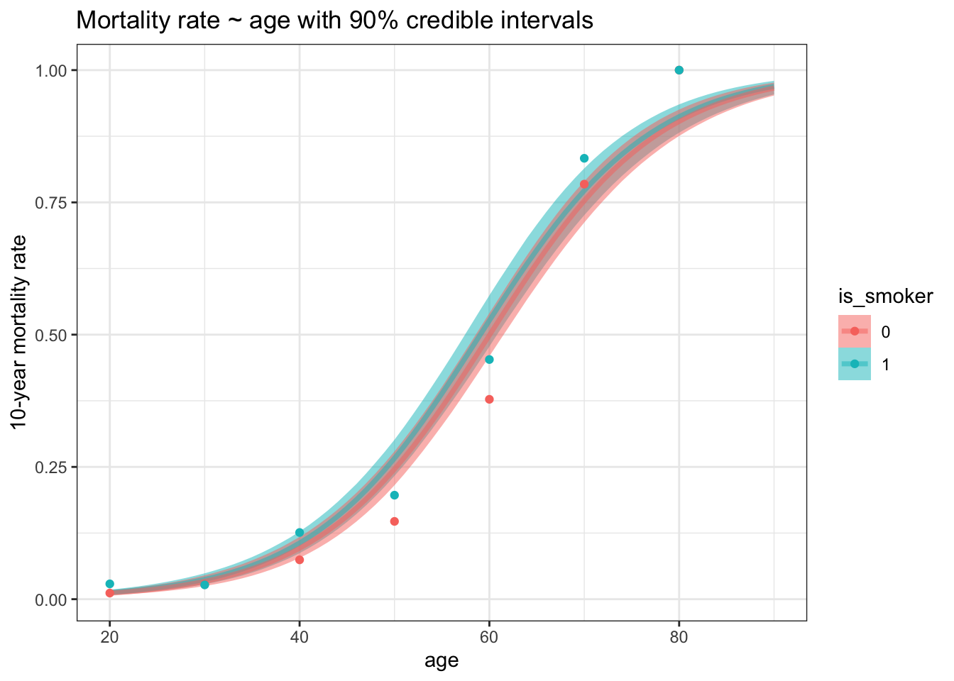 mortality_predictions %>%mutate(is_smoker =factor(is_smoker)) |>ggplot(aes(x = age, color = is_smoker, fill = is_smoker)) +stat_lineribbon(aes(y = p), .width =0.9, alpha =0.5) +geom_point(data = df_agg, aes(x = round_age, y = death_rate)) +labs(title ="Mortality rate ~ age with 90% credible intervals",y ="10-year mortality rate" )