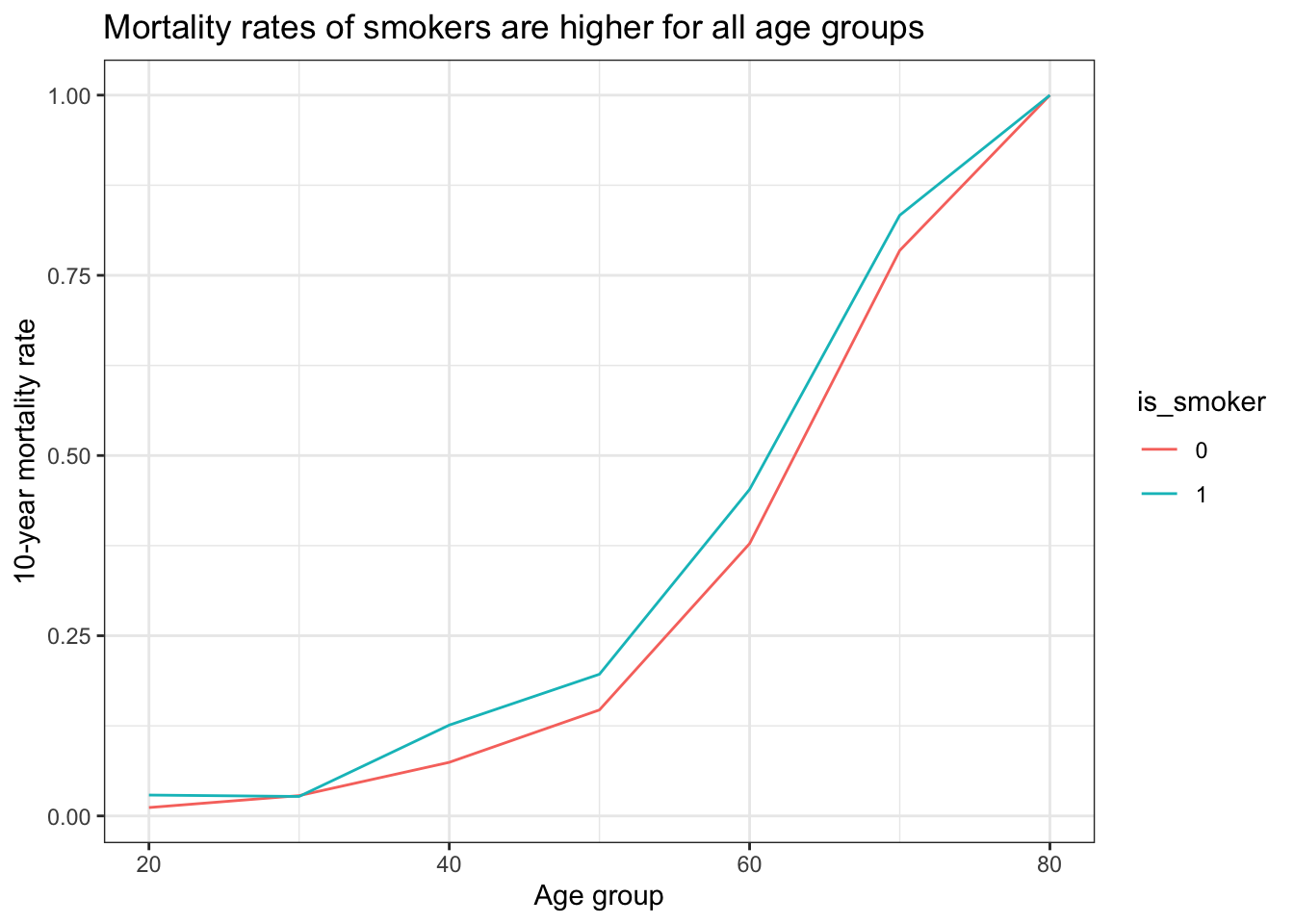 This shows a completely different picture! Smokers have higher mortality rates across all age groups. Before, we got different aggregated results because of different age proportions between smokers and non-smokers represented in the dataset. That’s known as Simpson’s paradox.