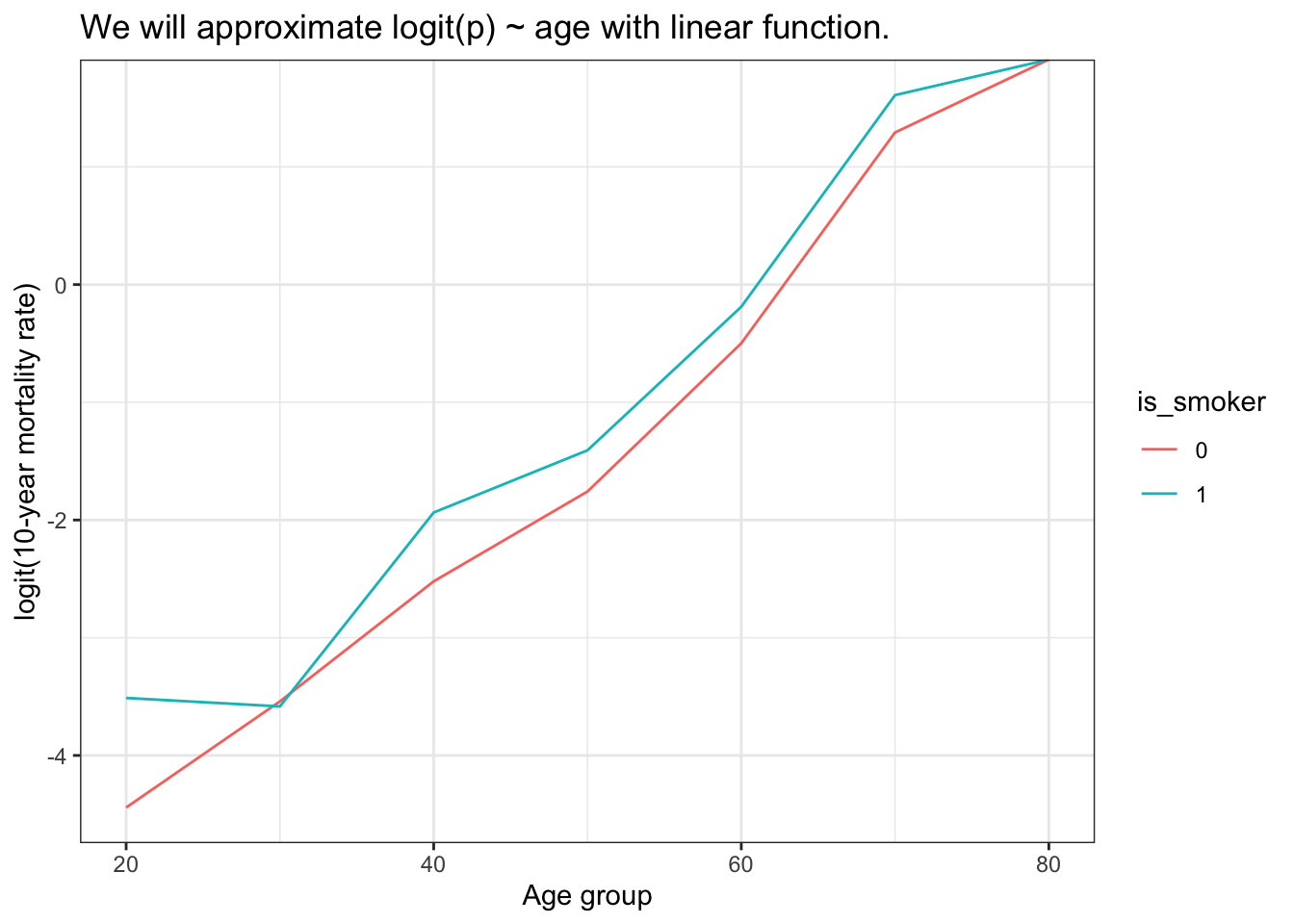 ggplot(df_agg, aes(round_age, qlogis(death_rate), color = is_smoker)) +geom_line() +labs(title ="We will approximate logit(p) ~ age with linear function.", y ="logit(10-year mortality rate)", x ="Age group" )