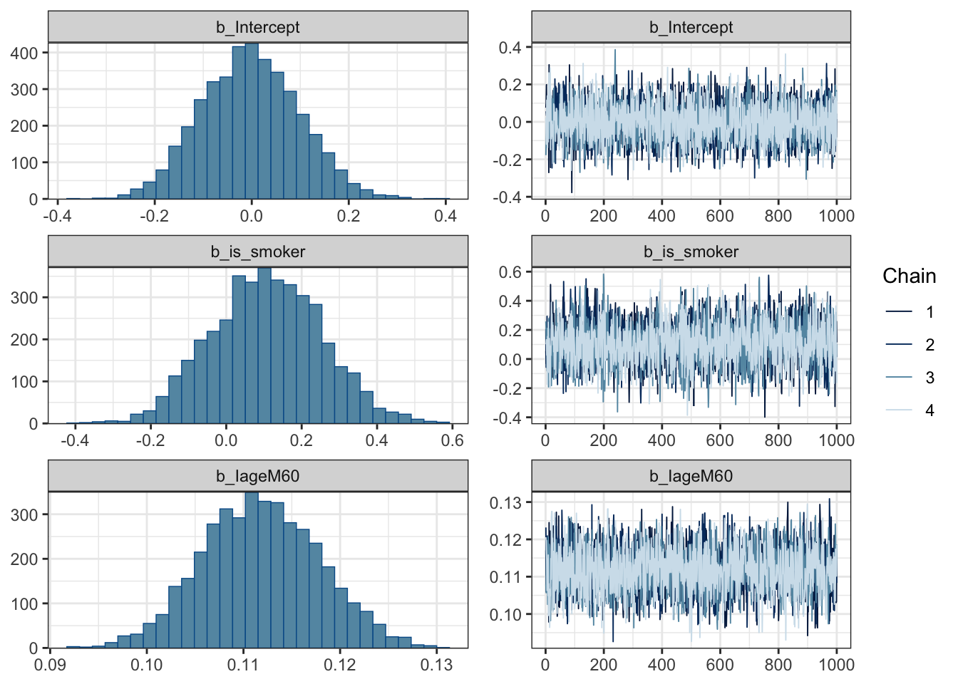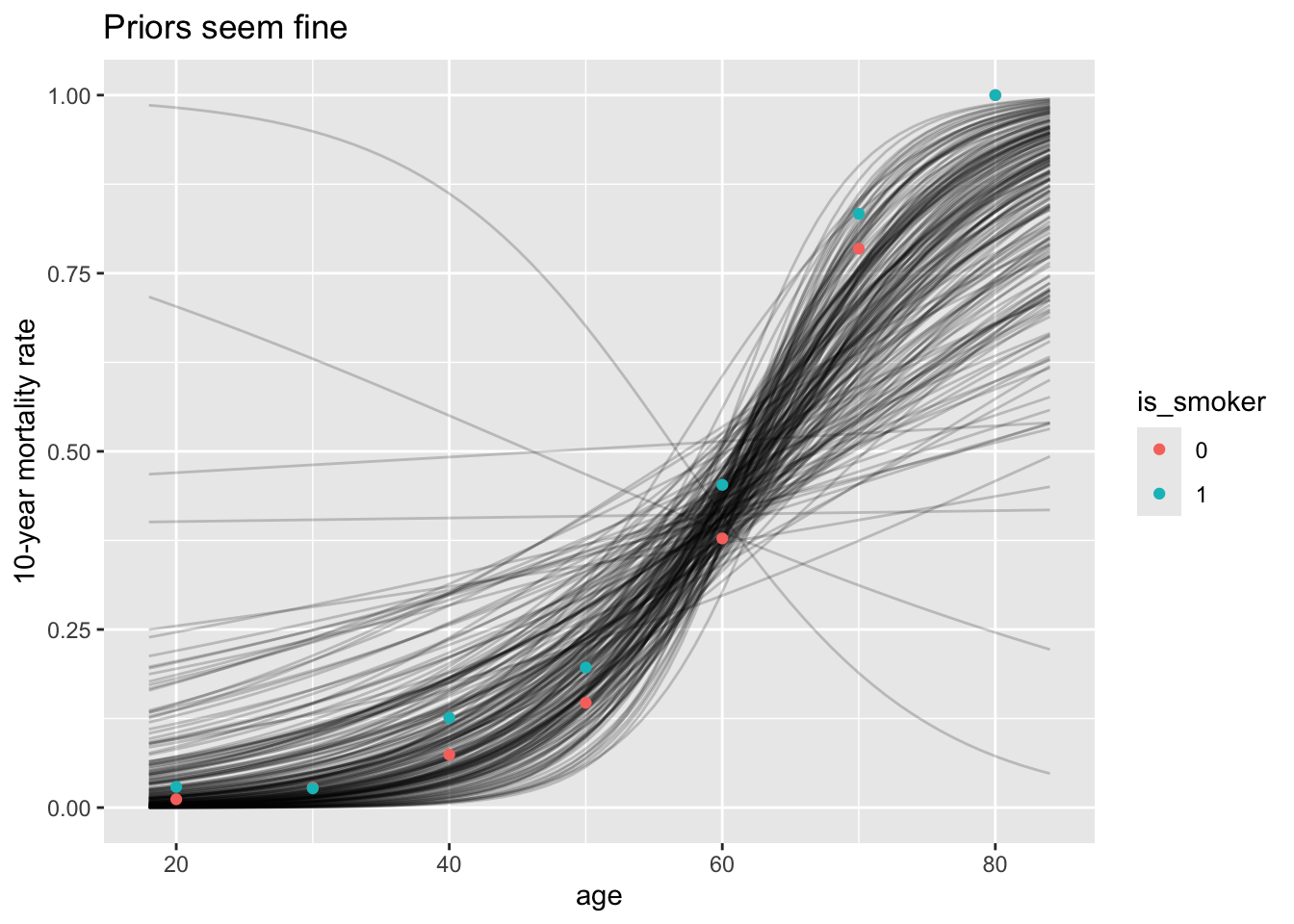 formula <-bf(is_dead ~ is_smoker +I(age -60))priors <-c(# Intercept for non-smokers at age 60prior(normal(-0.3, 0.2), class ="Intercept"),# Additive effect for smokers at age 60prior(normal(0, 0.4), class ="b", coef ="is_smoker"),# Slope for age (shared between groups)prior(normal(0.1, 0.05), class ="b", coef ="IageM60"))# Fit the modelm <-brm(formula = formula,family =bernoulli(),prior = priors,data = df,sample_prior =TRUE,refresh =0)
